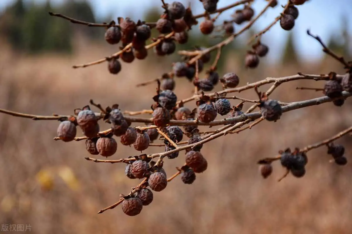 一直等到小雪时节,树叶落尽,黑枣颜色由之前的金黄色变深成黑紫色,外皮干缩成皱巴巴的样子。此时的黑枣因为在树枝上接受大自然的风霜洗礼,自然风干,积攒了一年的营养值到达顶峰。这时候再进行采摘,果实就变得像果干一样,果肉绵软甘甜,别具一番风味。