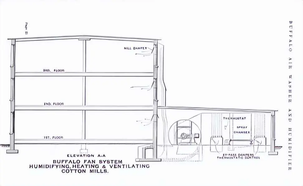 到了1906年,水牛城锻造公司向北卡罗莱纳州贝尔蒙的Chronicle纺织厂销售开利的“空气处理设备”,并将其应用于工厂风机加热器的通风系统。这是第一套工业用“中央”加湿系统。