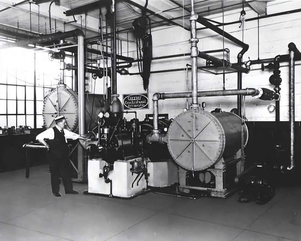 到了1921年,威利斯·开利他们研发出了离心式水冷机组。可能很多人没有听过离心式冷水机组,但是医院、商场等面积较大的场所应用的中央空调需要用到冷水机组,他对中央空调有着至关重要的作用。他的出现让空调蒸发、冷却所需要的体积大大变小,制冷效率也得到了很大的提升,在寸土寸金的城市中有了使用的可能。在这之后中央空调的冷水机组种类也越来越多,螺杆式冷水机组、涡旋式冷水机组、风冷式冷水机组等等