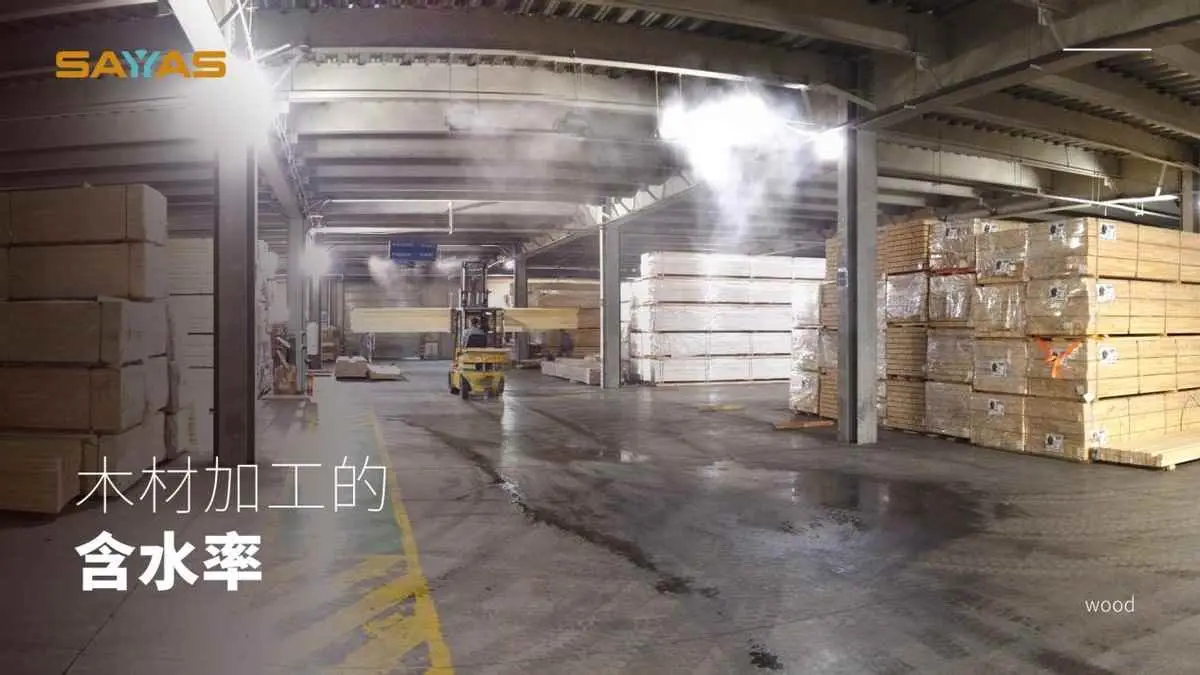 为此,森鹰引进了丹麦的加湿系统,安装在车间上方不同的点位,当车间湿度<50% 时,系统自动启动加湿功能,通过高压线及高压喷嘴和空气混合后达到预定的湿度值,以保证木材在加工过程中的含水率符合标准。