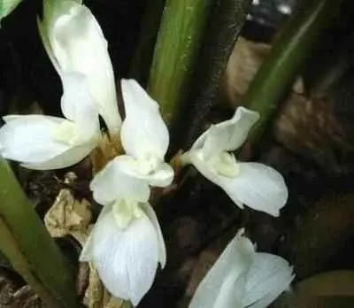夏秋开花,总状花序顶生,疏散,有花数朵,苞片线状披针形,内卷;花小,色白,萼片狭披针形;花冠管基部扩大;裂片细小;外轮的两枚退化雄蕊倒卵形,先端凹入,内轮仅及外轮之半。
