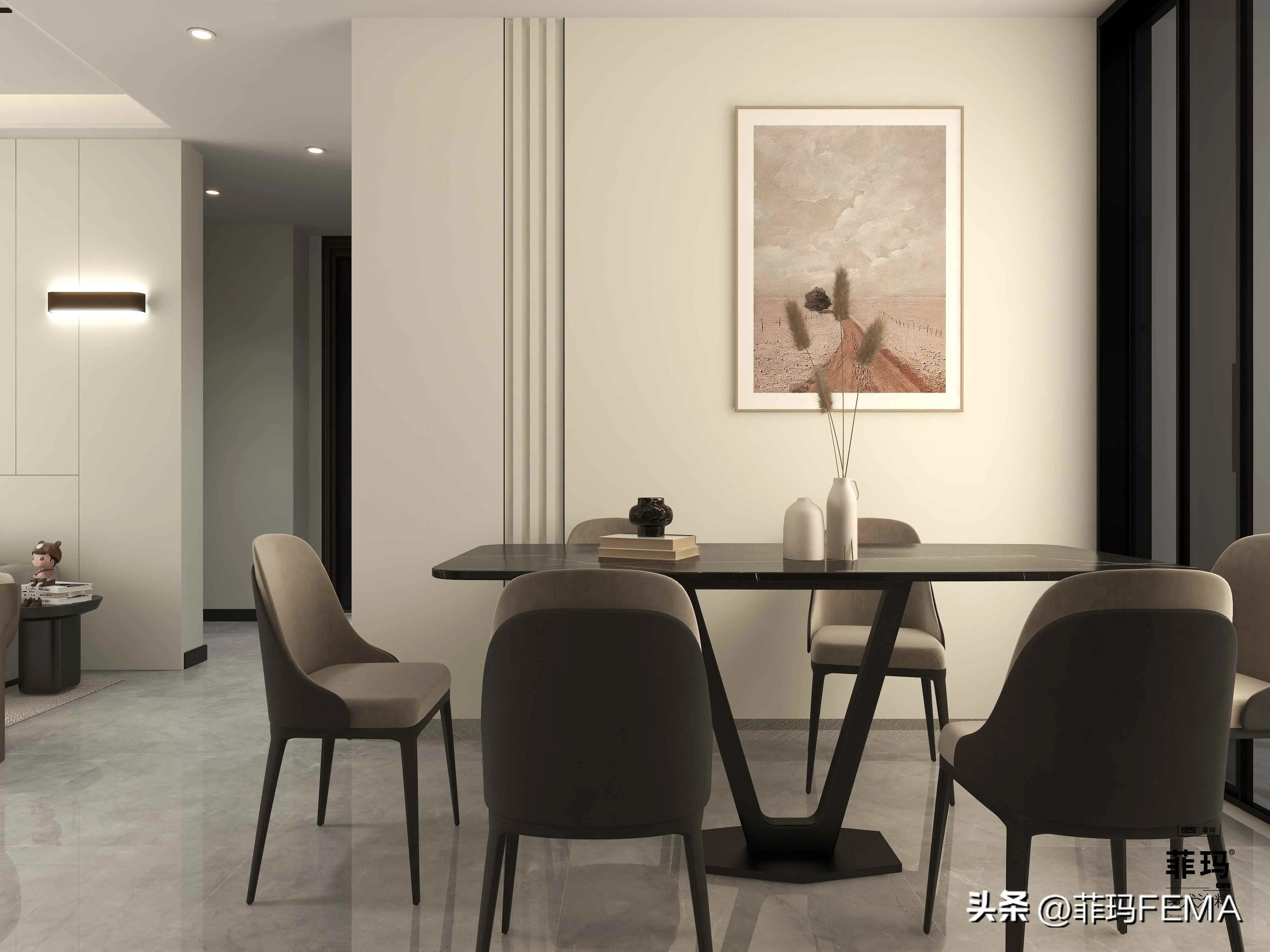 餐厅与客厅一体,咖色墙面优雅又温馨,搭配深咖色座椅,黑色岩板桌面,透露出满满的质感,不仅提升用餐的舒适感,还兼具清洁功能,让日常清洁变成一件简单的事。