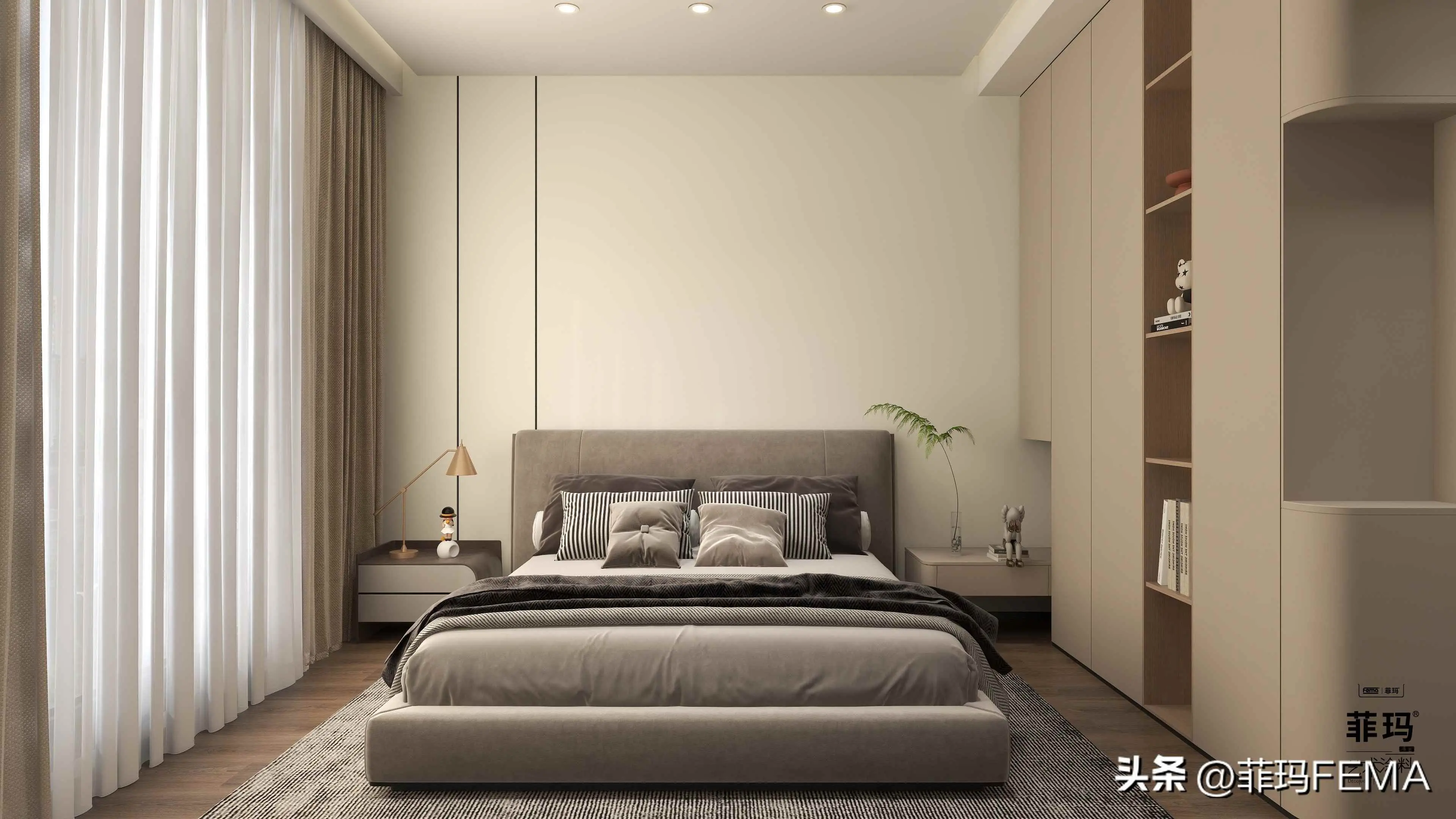 卧室墙面分别选用奶咖色、奶油色为主色调,背景墙搭配时尚感十足的装饰画,营造出干净温馨的卧室空间氛围。衣柜一柜到顶,给足收纳空间,可以放下四季的衣物。床是整个卧室空间的中心,落地式设计给足人安全感,搭配白色、咖色系床品,温馨感爆棚。