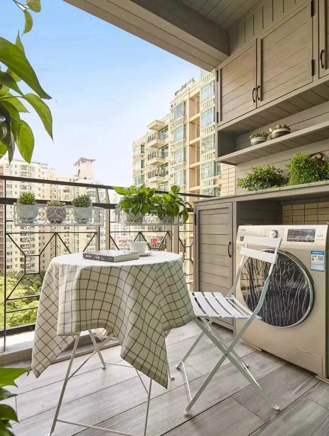 (3)阳台的洗衣机柜旁可以设置洗衣池,并在洗衣机柜上下方装开放式收纳架,将常用的洗衣液、洗衣粉、肥皂、刷子等小物品,摆在随手可得的地方。也可以将洗衣池换成洗手盆,喜欢花种草的业主可以直接在此接水,也方便洗手。