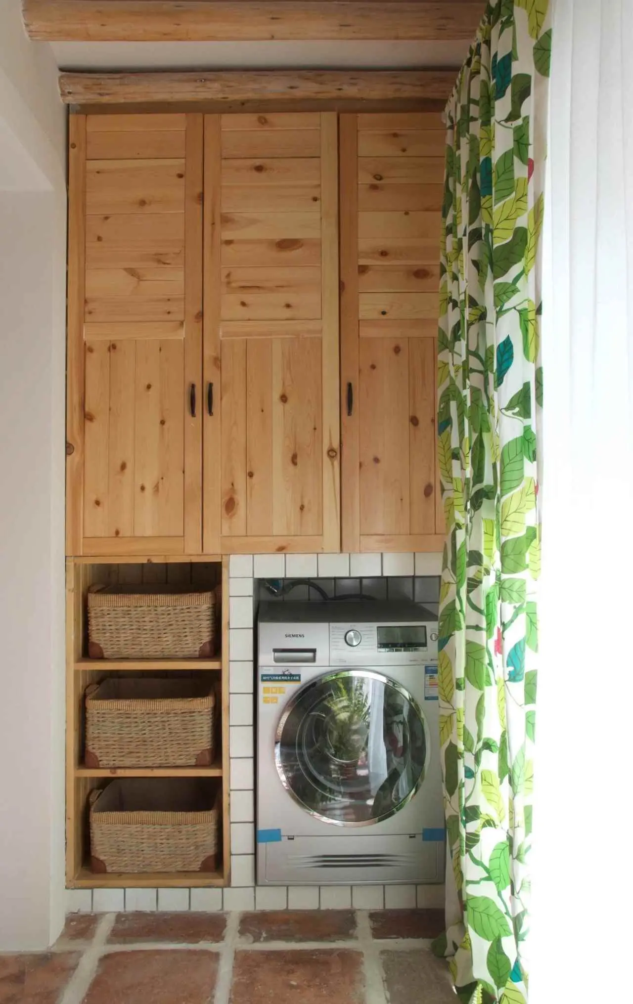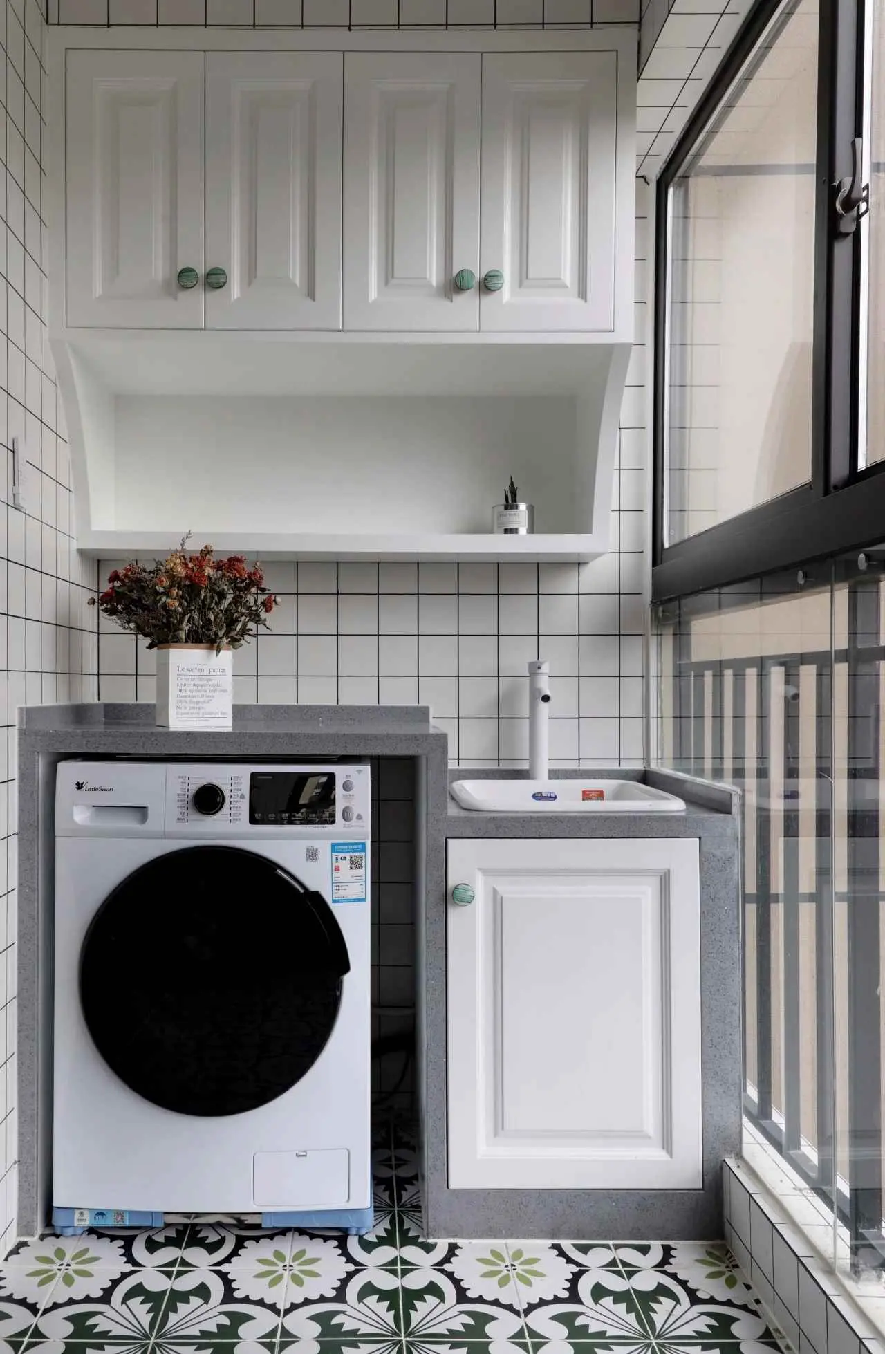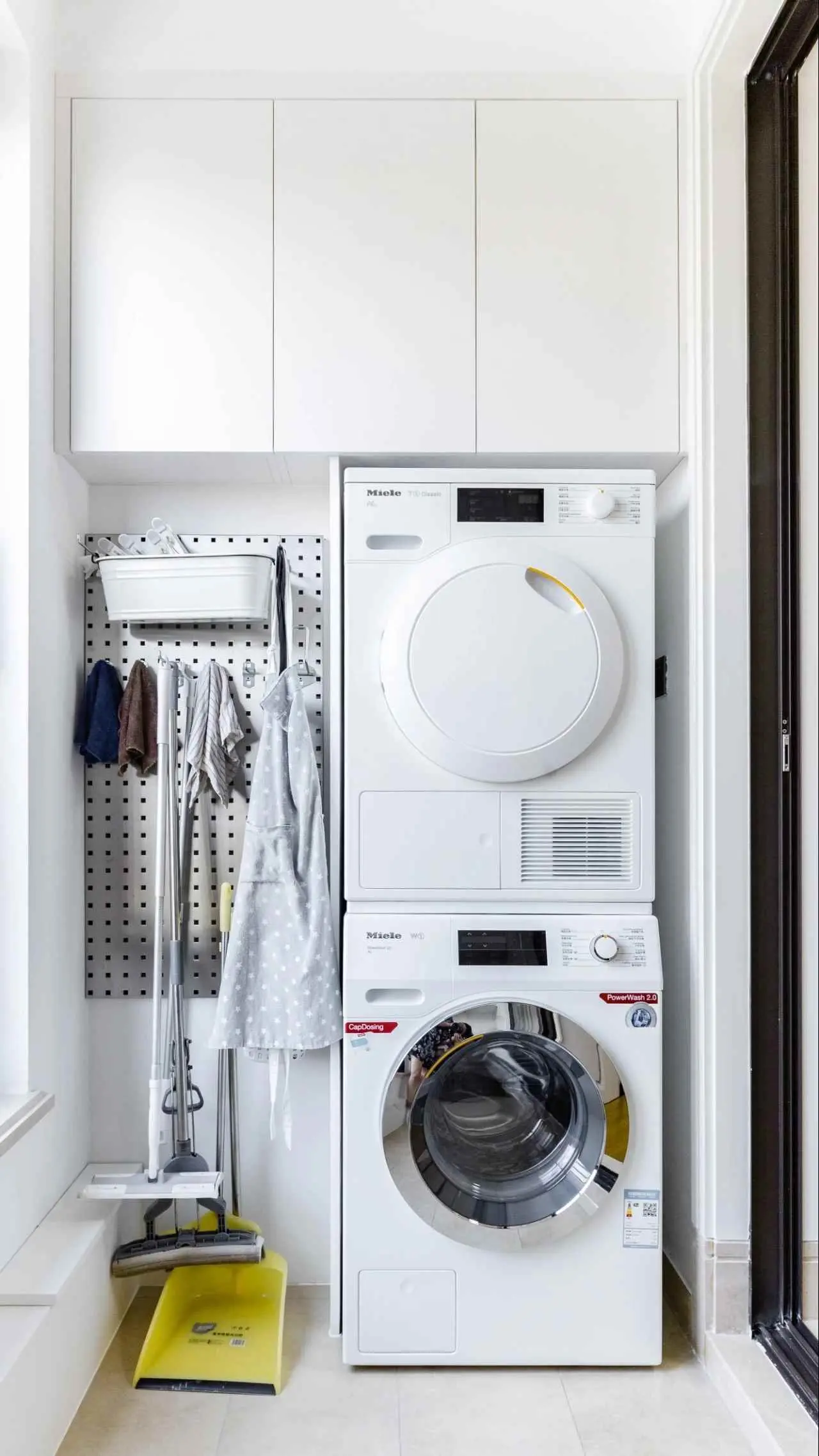上方吊柜的前提下,也可以去掉拖把池,在洗衣机旁多余的空间内放置扫把簸箕等清洁工具,比直接放在客厅美观很多。