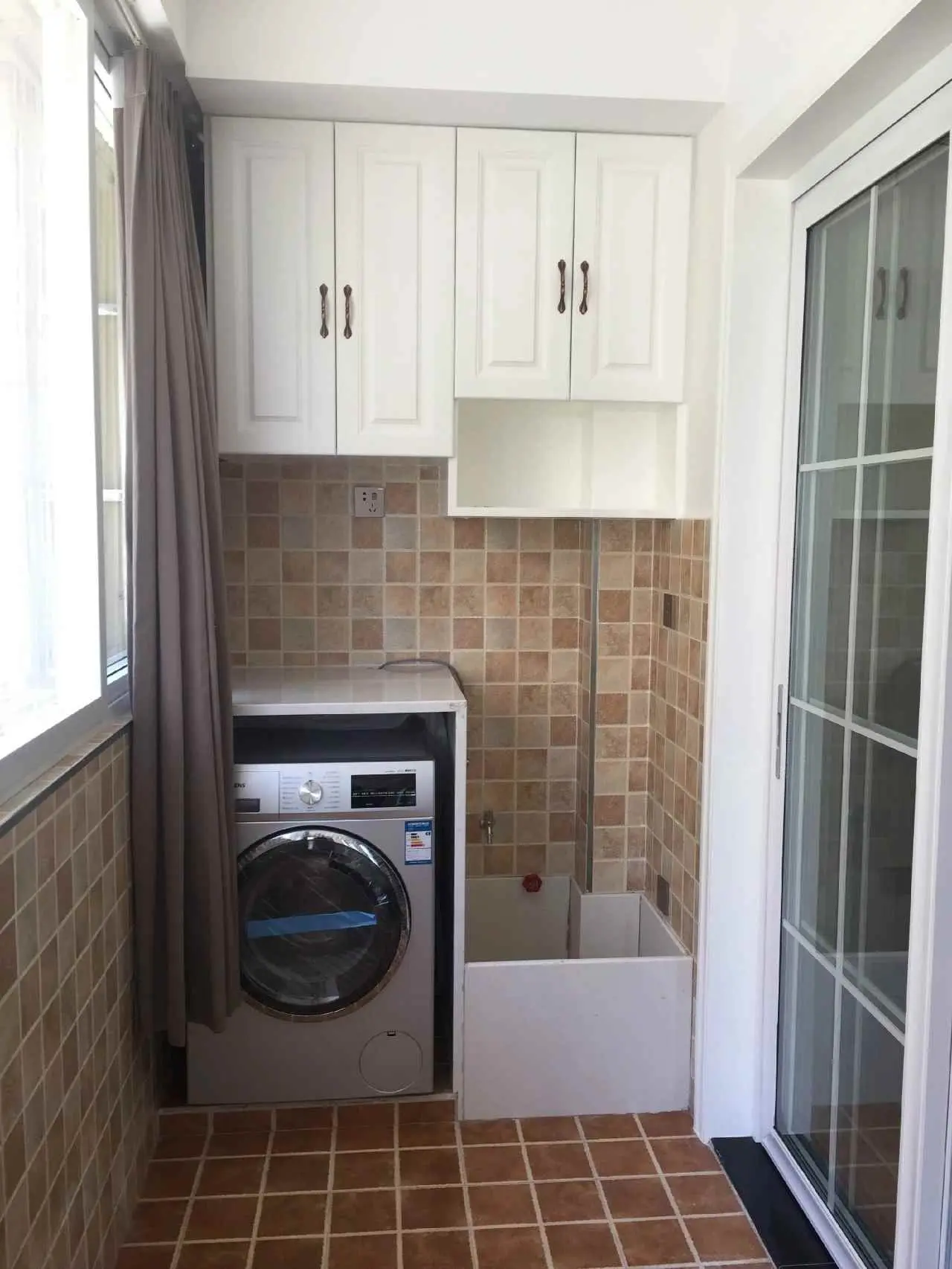 (2)在洗衣机上方定制吊柜,为了清洁方便在洗衣机旁边设置拖把池是个巧妙的设计,平日里湿拖把放在卫生间容易发臭,而放在阳台就能避免此类问题发生。