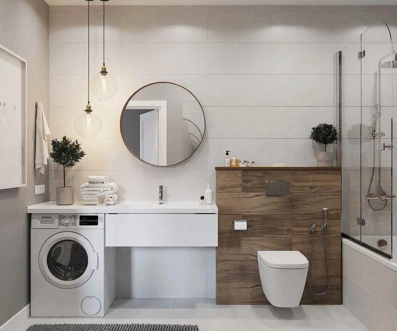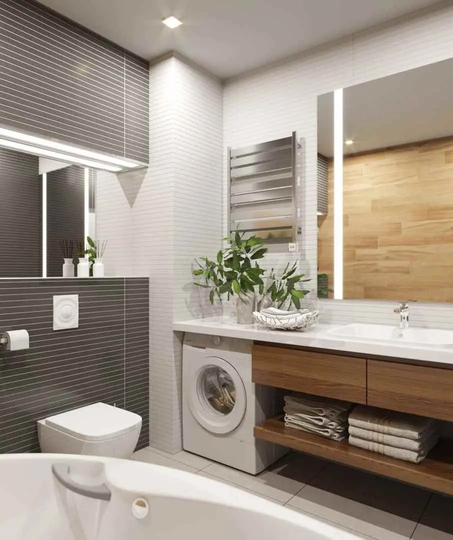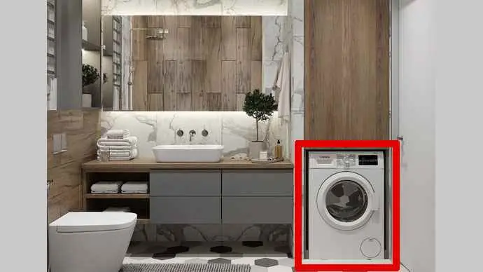 (1)洗手台下方无疑是最优先考虑的位置,因为这个区域通常距离淋浴区比较远,对洗衣机的保护程度也比较高。洗漱台下面放洗衣机,不仅能够高效利用有限的空间,还可以减少水汽对洗衣机的影响,而且平时洗漱之后,直接把要洗的衣服丢进去,缩短了家务动线,非常便捷,而且排水也很方便。如果想要空间更整洁,可以考虑安装一个柜门,让洗衣机彻底隐形。
