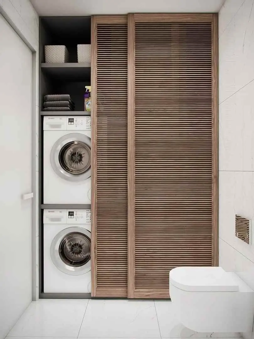 (3)还可以将洗衣机隐藏在柜体里,越是小面积的空间,越是简洁当道,洗衣机完全可以藏起来。