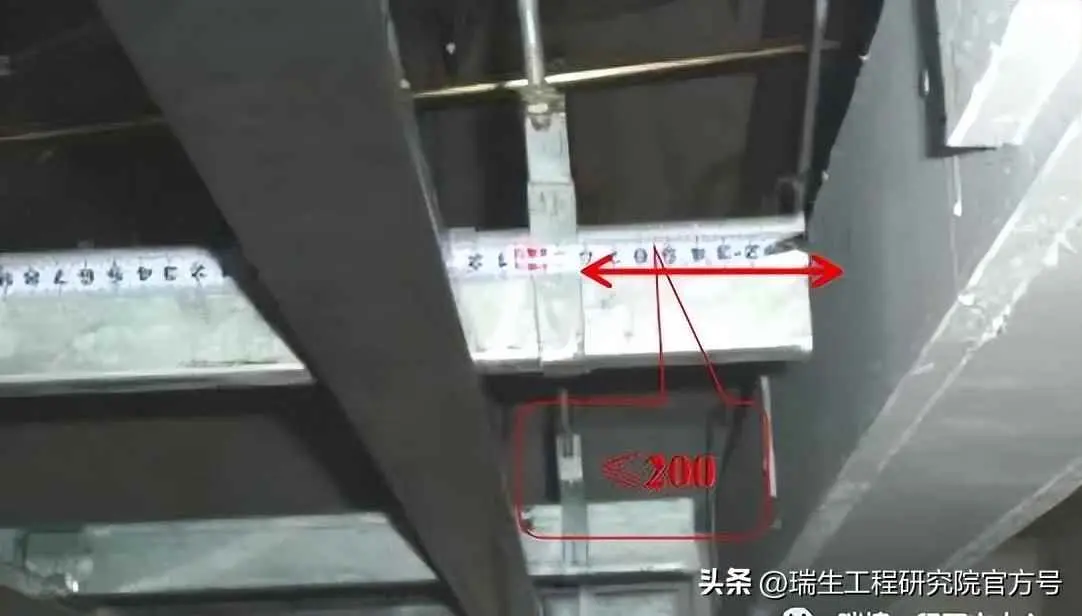 吊杠数量设置不足,吊杠设置间距过大,吊杠高度超过1.5米未设置反向支撑或转换层。
