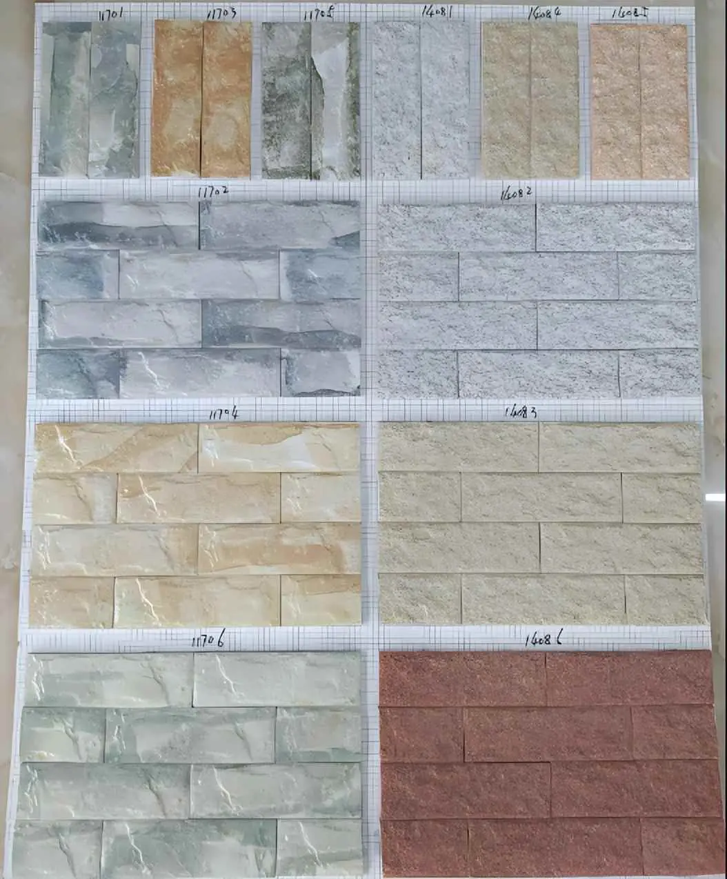 纸皮砖分好多类,按材质、成型方式、生产方式、包装方式、表面质感、面状、施工方法等等,五花八门。比如,有釉面的,有通体的;有挤压成型的,也有干压成型的;还有按包装分贴纸的和散片的,选择多多。