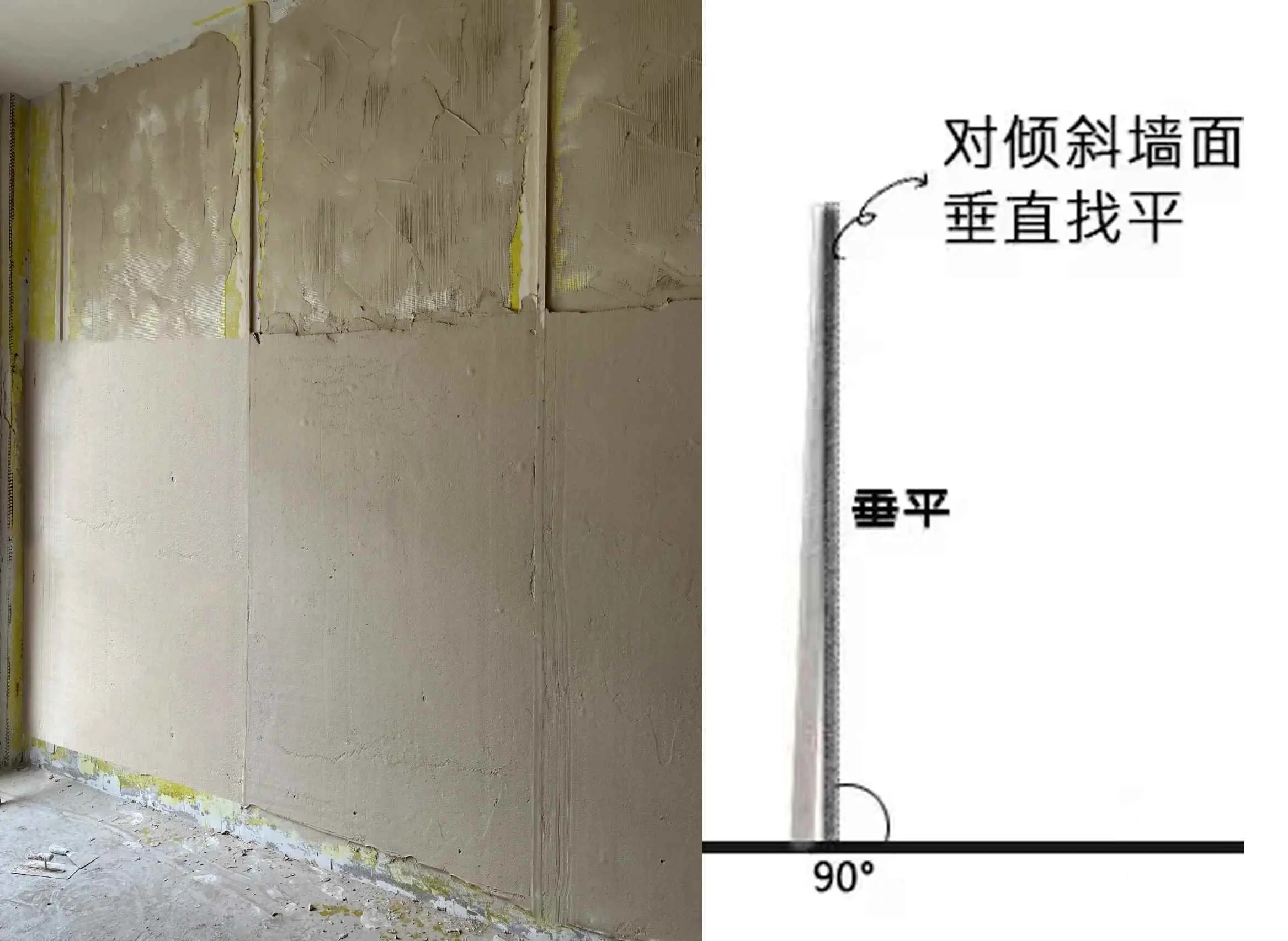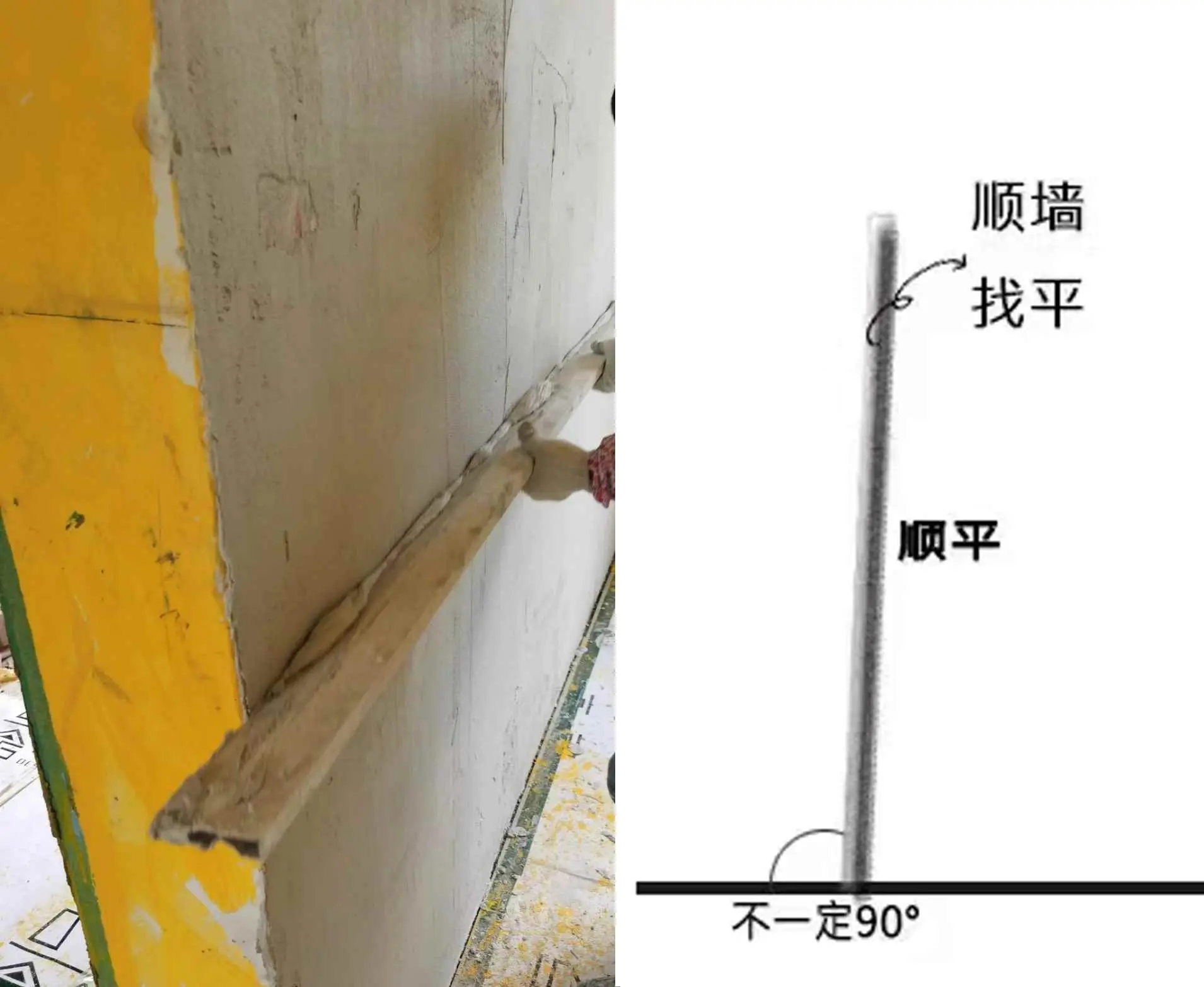 ①找顺平一般适用于同一面墙平整度相差不大的情况下,不用管墙面的角度,顺着墙面涂抹材料,之后用靠尺刮平处理即可。找平后用2m的靠尺检测墙面,误差不超过3mm。