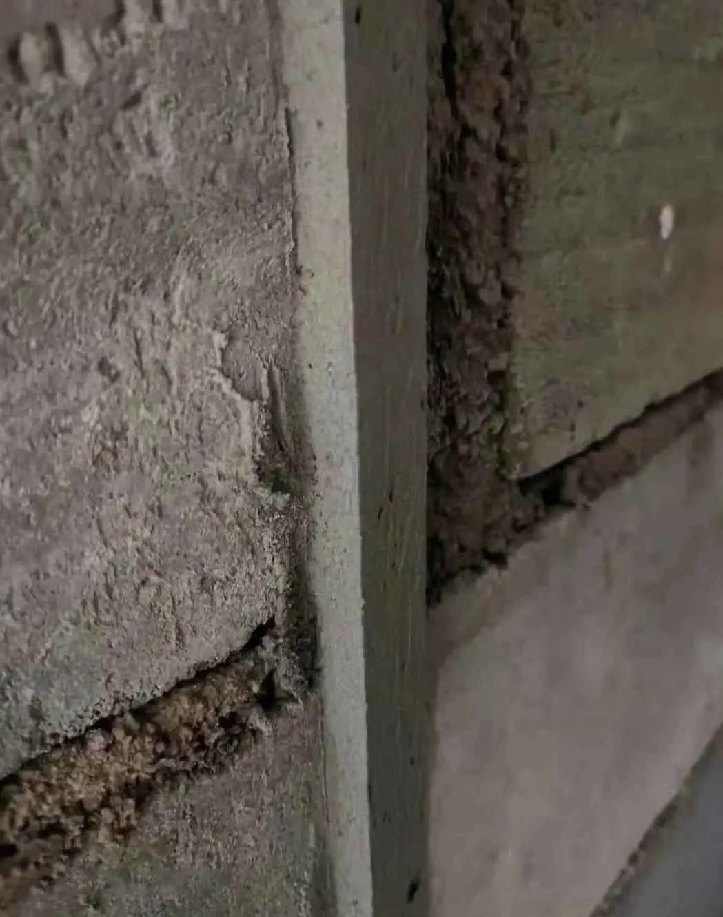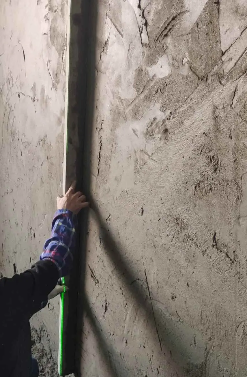 拿靠尺紧靠石膏饼,冲出一条垂直于地面的“筋”,筋的厚度不超过20mm,太厚容易裂,宽度等宽于靠尺,筋与筋间距500mm,并用水平仪校准。