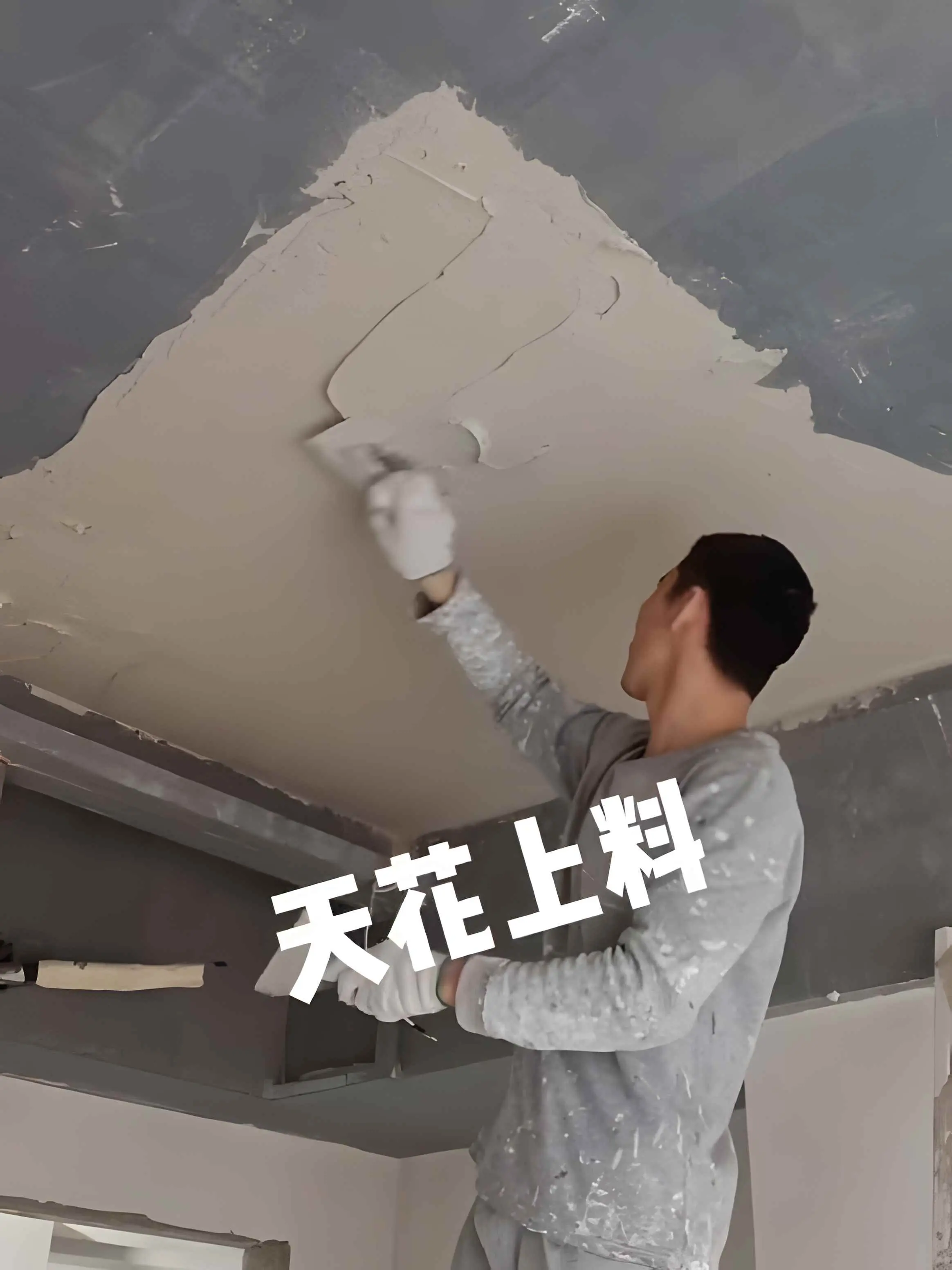 ①在顶面先用抹刀抹一层粉刷石膏,力度要大,紧贴顶面;