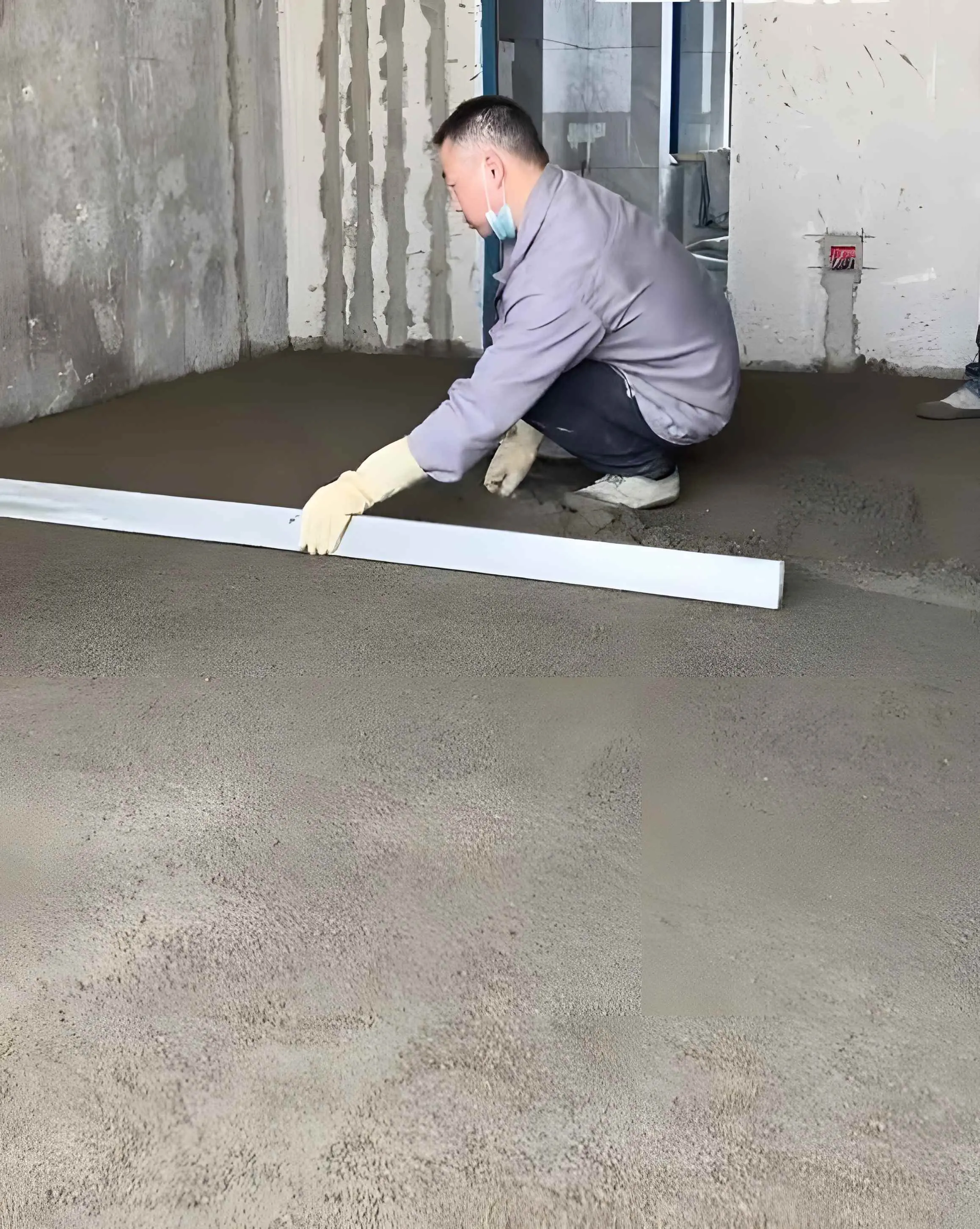 将水泥和砂按照1:2的比例配置成砂浆,大面积浇筑到地面上,用抹子配合靠尺顺平。