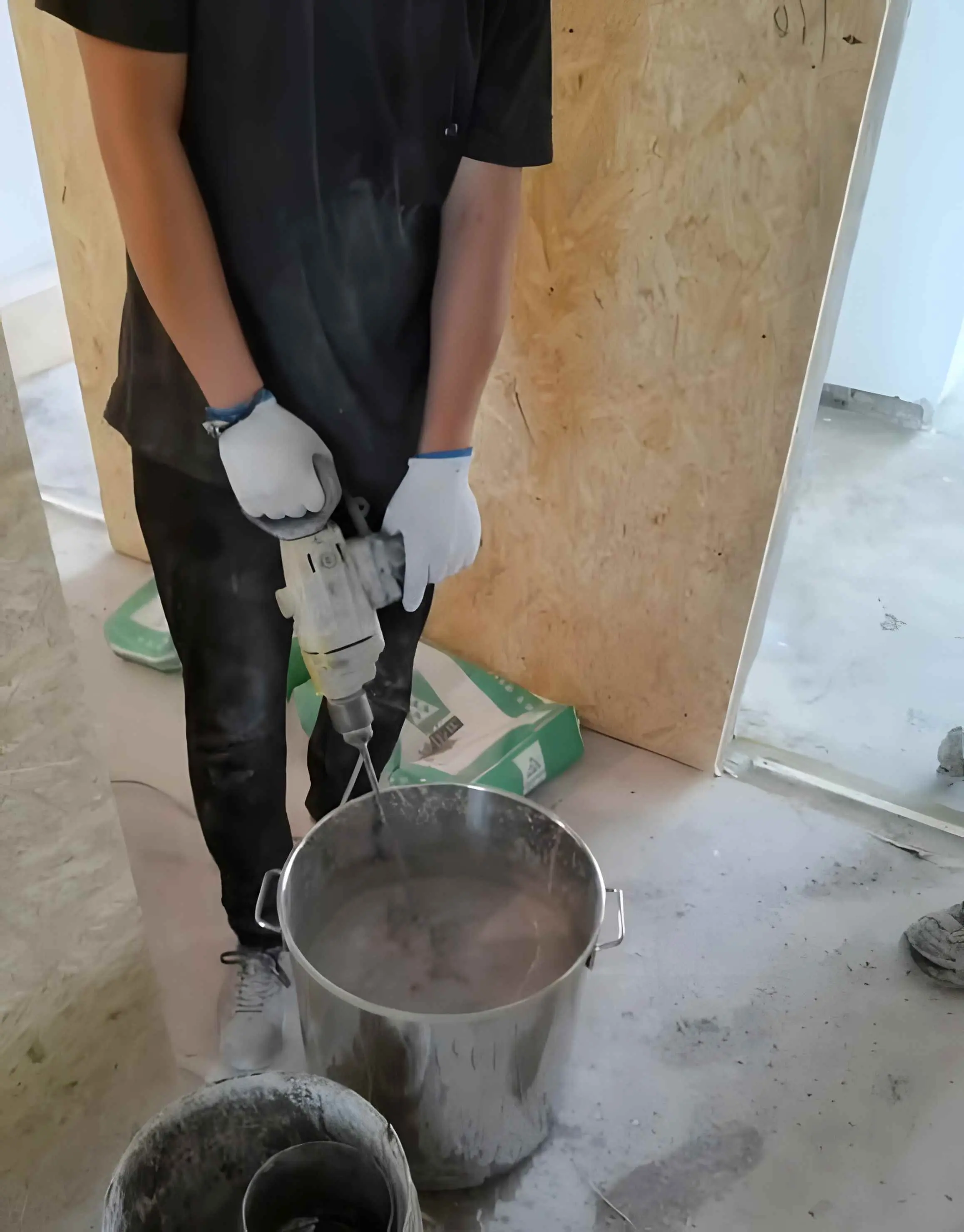 按比例加入材料,用搅拌机持续均匀搅拌3-5分钟,直至形成稠度均匀、无结块的流态浆体。