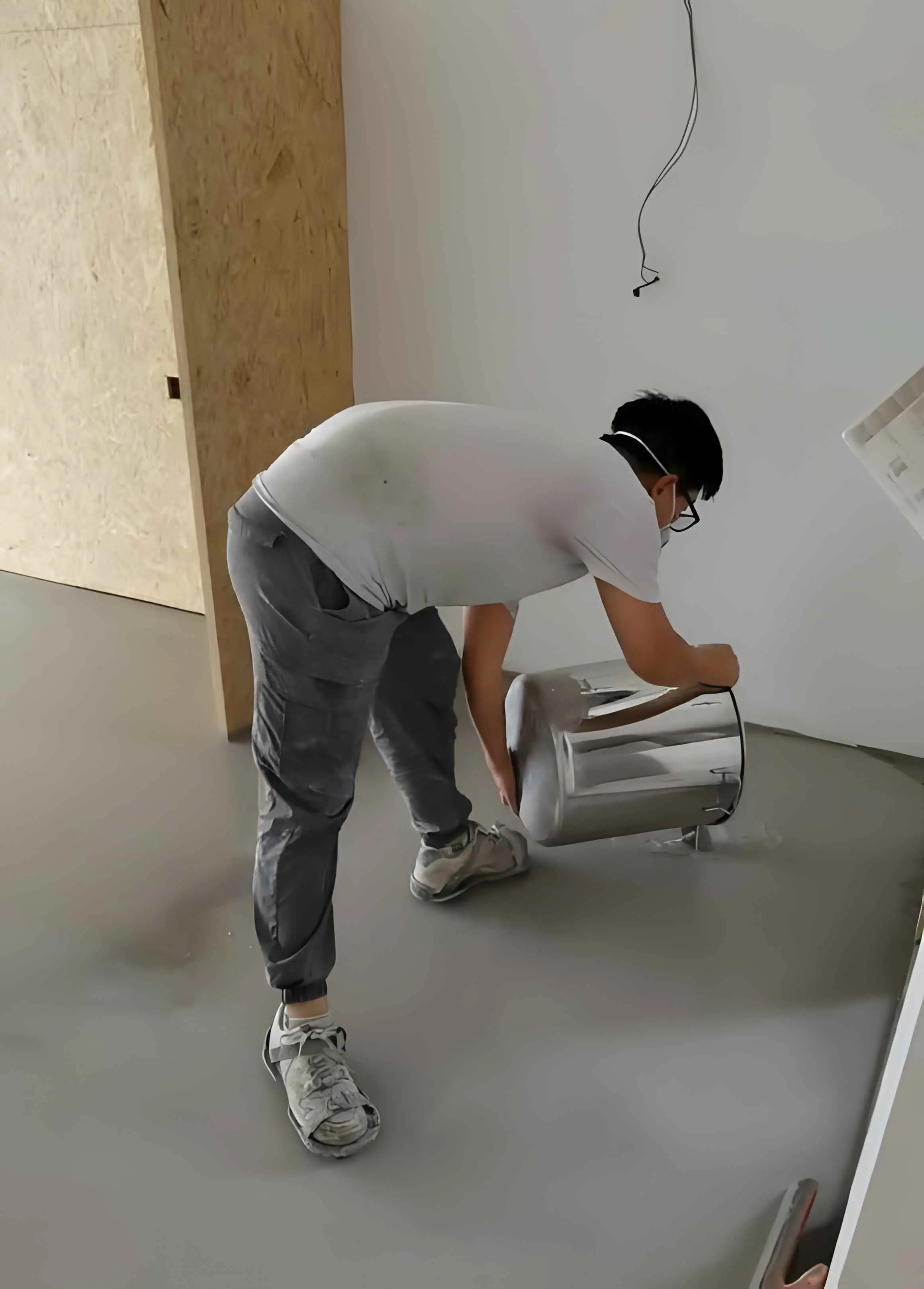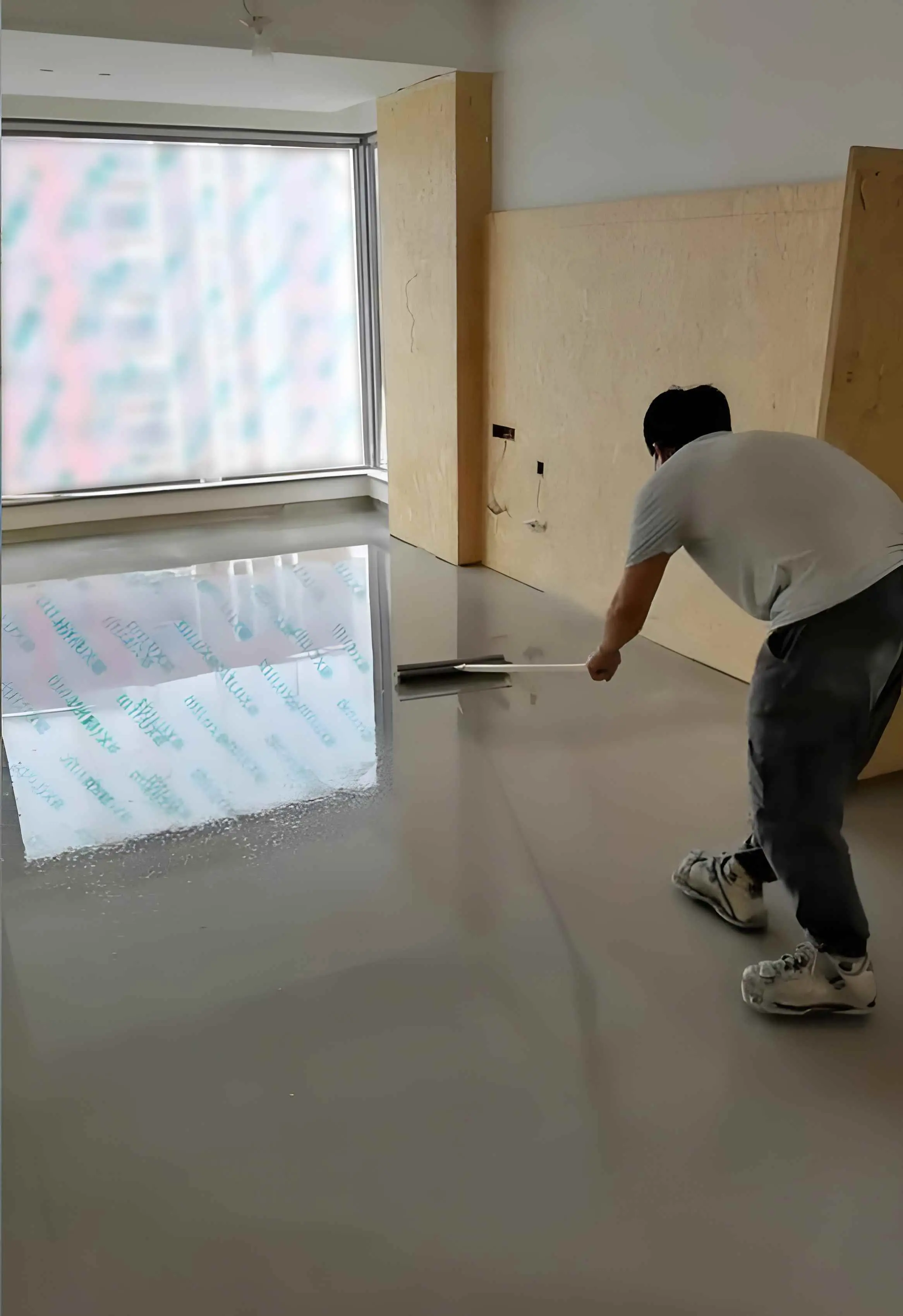 浆料摊铺后,需要用消泡滚筒沿着一个方向在地面滚动,清除气泡,大约1-3天左右就能干透,干透后才可进行下一步的施工。
