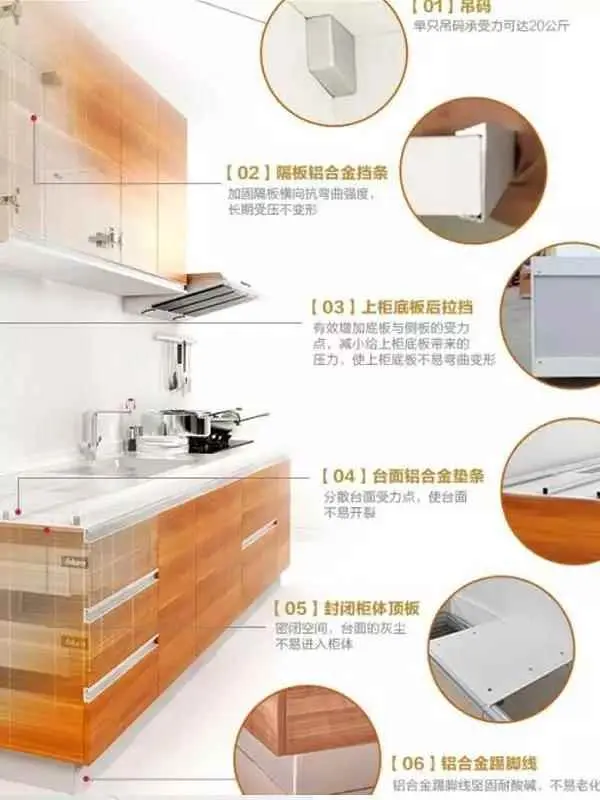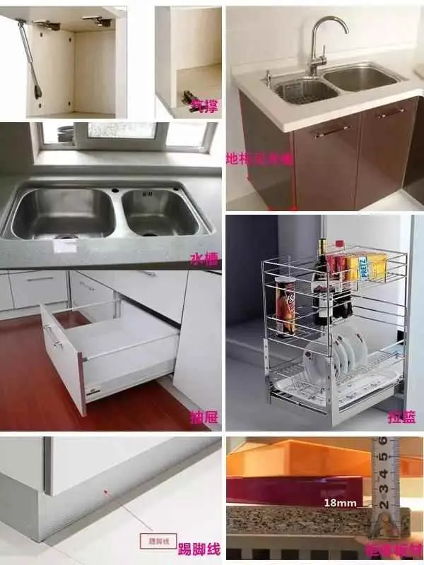 橱柜还有一些其他的东西来组成。他们分别是什么呢?水槽:涉及到台下盆,见光面:美化侧面效果,抽屉:可空间设计,柜体:防潮板等组成,碗篮/拉篮:储存作用,