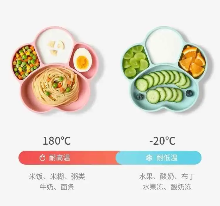 硅胶分隔餐盘分格造型的分隔餐盘,能将食物有序、规整的摆在餐盘中,让人食欲倍增,方便宝宝自行取食,锻炼自主进食能力。硅胶一体成型的餐盘清洗起来也很方便。