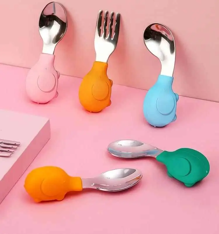 不锈钢叉勺随着宝宝手部动作越来越灵活,可以开始尝试不锈钢材质的勺叉。挑选时注意勺叉边缘圆滑,不要伤到宝宝,勺柄硅胶材质方便宝宝抓握,略有些重量可以锻炼宝宝的手部力量。