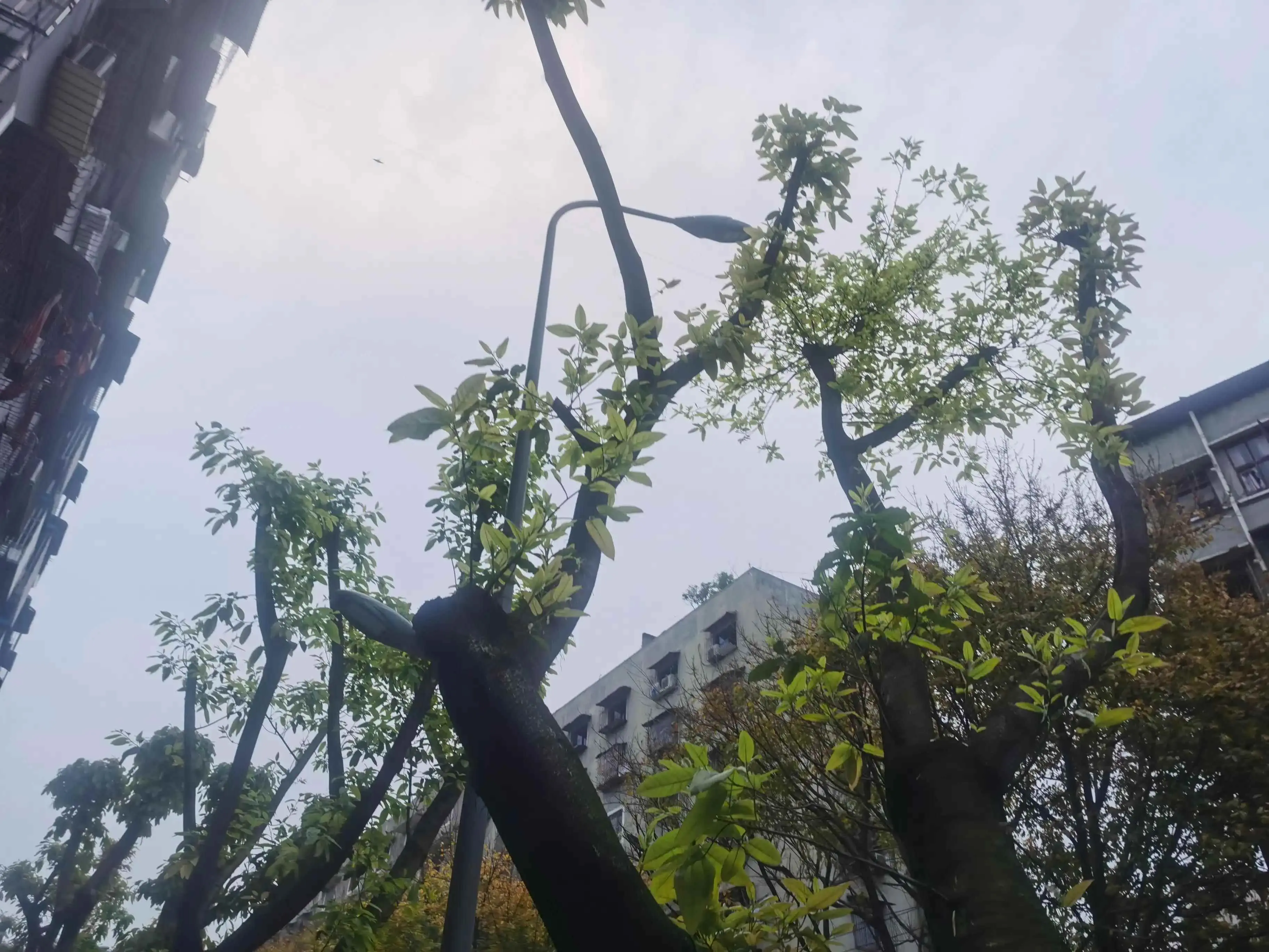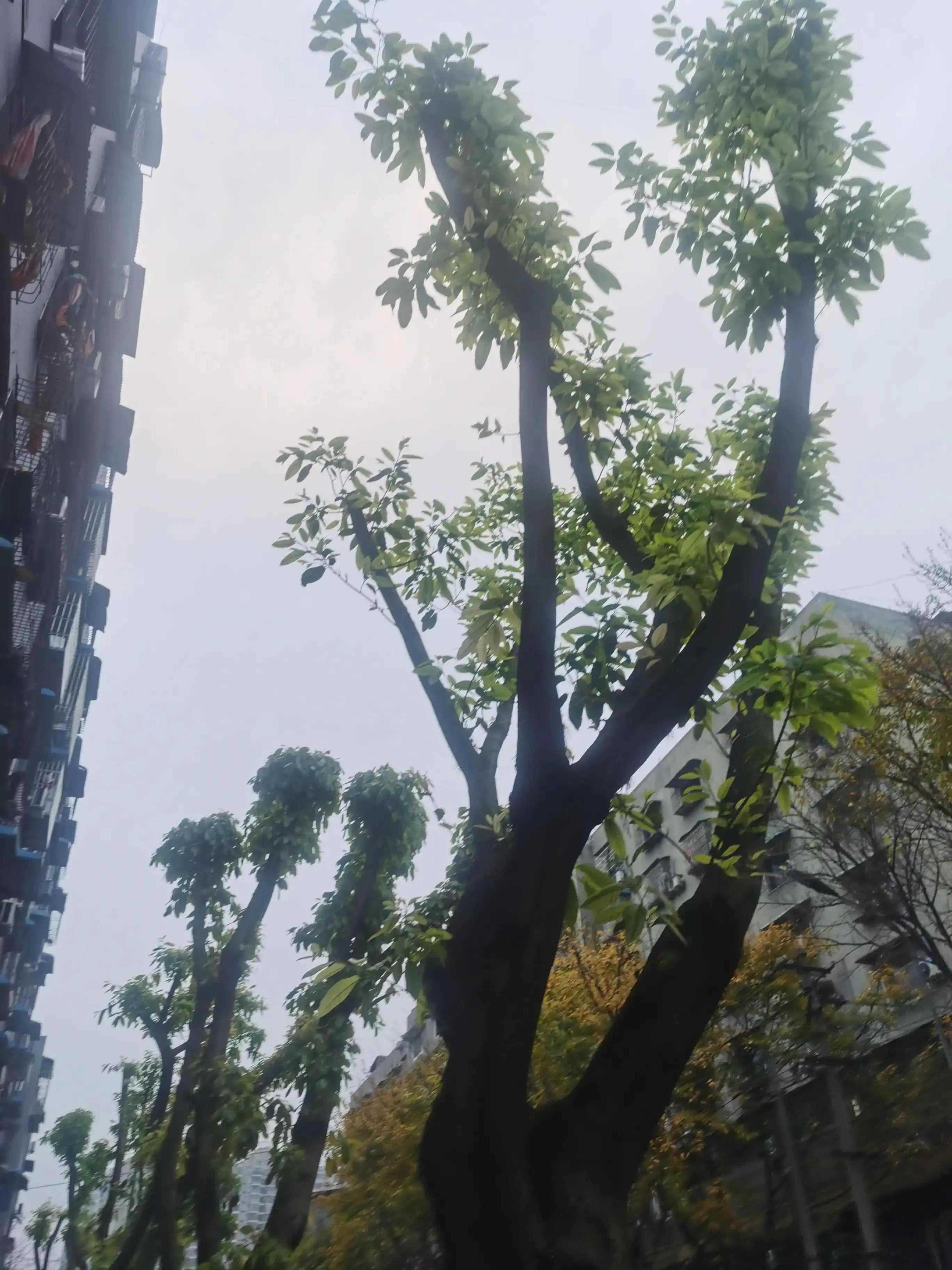因为在市区,树木都会被工人定期修剪枝丫,现在已经是光秃秃的了