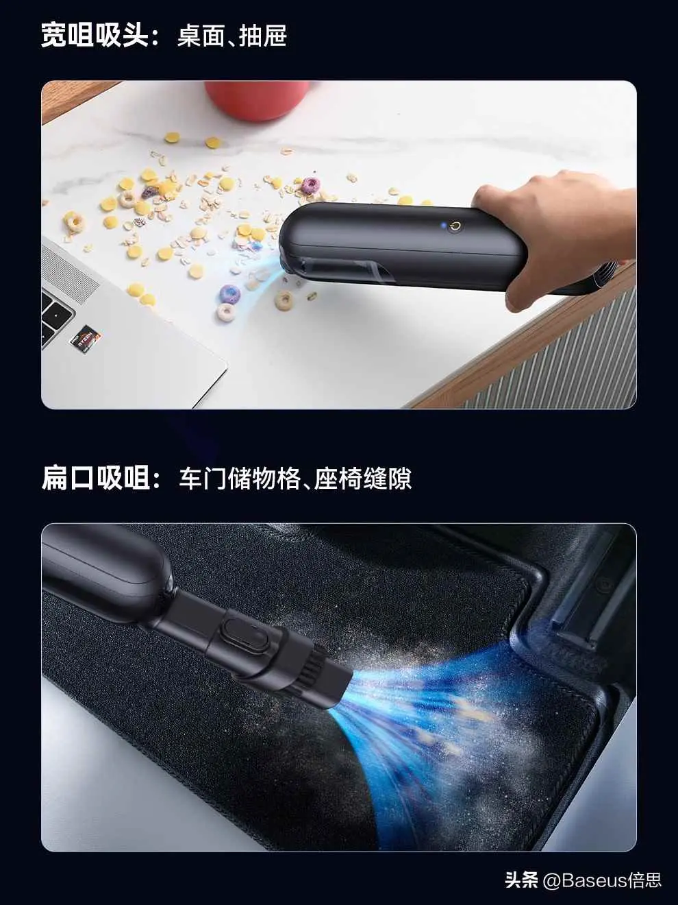 这很好理解,车内空间本就充满限制,灰尘更是藏于各个角角落落,如果能够灵活触达犄角旮旯,便携式吸尘器的吸尘效率也将更高。轻盈便捷,高效净吸,这正是我们推出 Baseus倍思 A0 Pro 车载吸尘器的初衷。