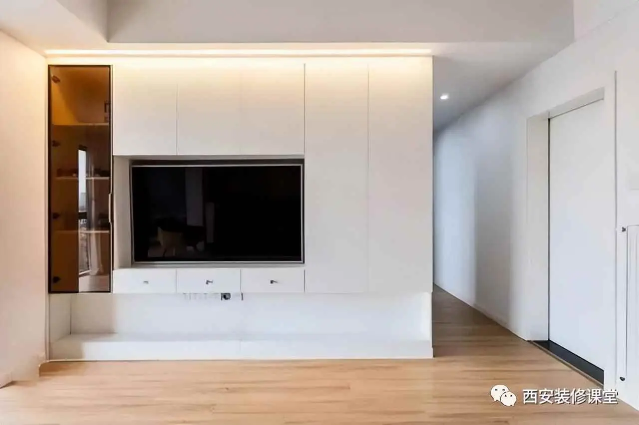 ▲面积小的电视墙满墙柜,最好弱化杂乱感,采用吊顶压低空间,不会显得定制又高又压抑
