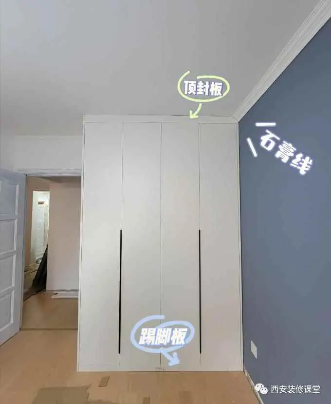 ▲更不要做个难看的石膏线了,石膏线就是偷减工艺的行为,既然做了石膏线最好吊顶,不做吊顶石膏线不能沾到柜子上方,就是导致直接断开的翻车做法,而且衣柜还又高又难看