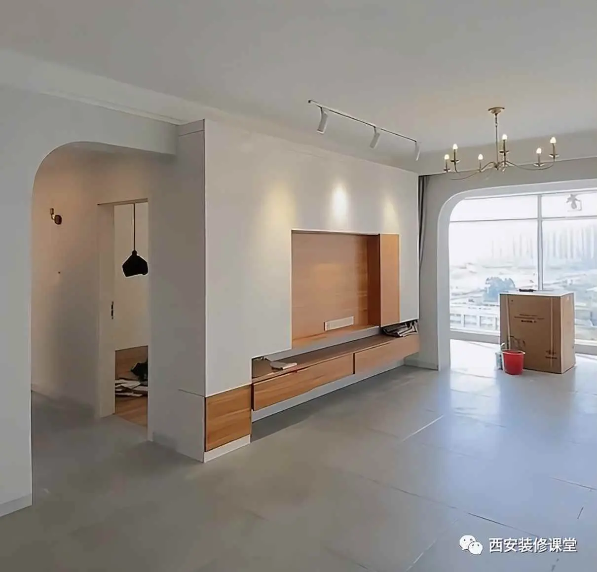 ▲如图电视满墙柜分开视觉层次定制,但是没有做吊顶,这样就会导致越小的空间,定制细高,显得视觉非常压抑