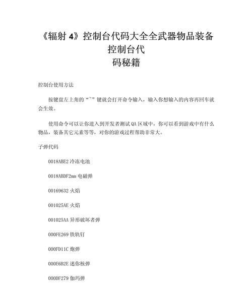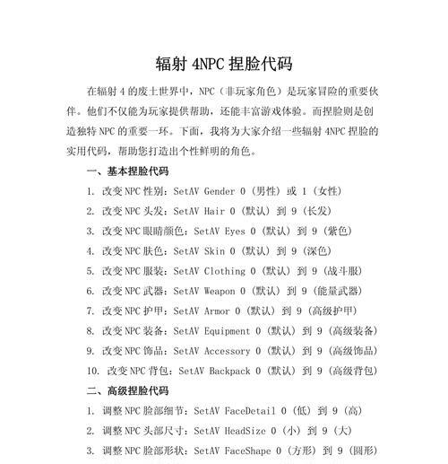 辐射4是一款备受玩家喜爱的角色扮演游戏,其最大的特点就是可以自定义角色。不仅可以选择性别、种族、属性等基本信息,还可以在控制台中使用捏脸代码进行自定义修改。本文就来详细介绍辐射4控制台捏脸代码,让你能够轻松打造出自己理想中的游戏人物。
