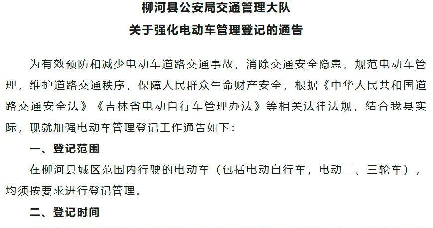 近期,吉林省通化市柳河县公安局交通管理大队发布的《关于强化电动车管理登记的通告》明确,从11月1日开始,辖区内所有未上牌或备案登记的电动车、非标车电动车将禁止上路行驶,违者将依法予以处罚。