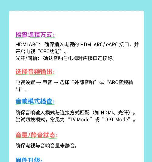 相信通过本文,您已经学会了如何解决音响无声问题。在今后的使用中,也可以根据以上步骤进行检查和排查。让我们的家庭影院重现美妙音乐盛宴。
