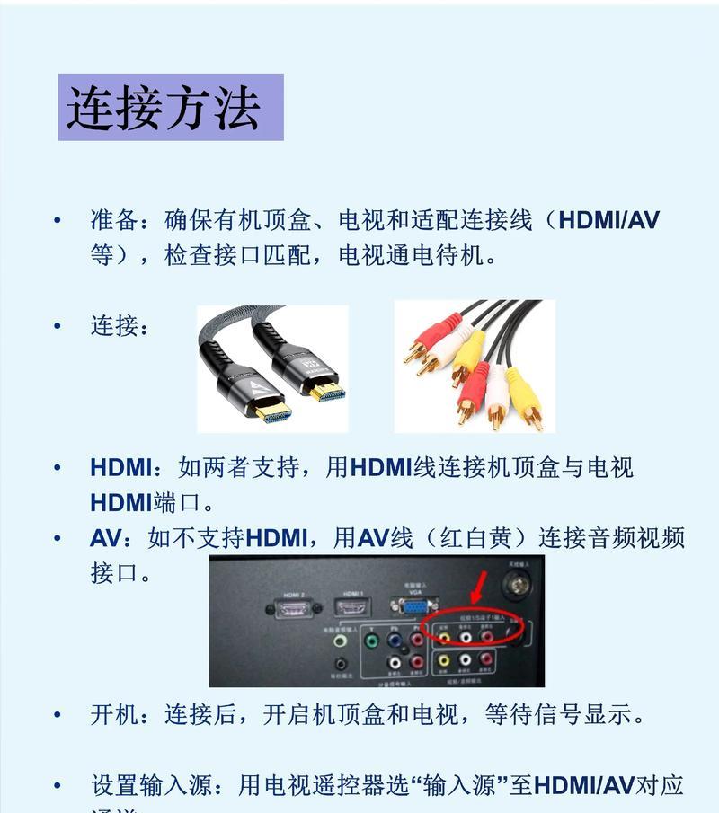 在开始之前,请确保您已经准备好了所有必要的设备,包括电视机、机顶盒、遥控器和相应的连接线缆(HDMI线或AV线)。