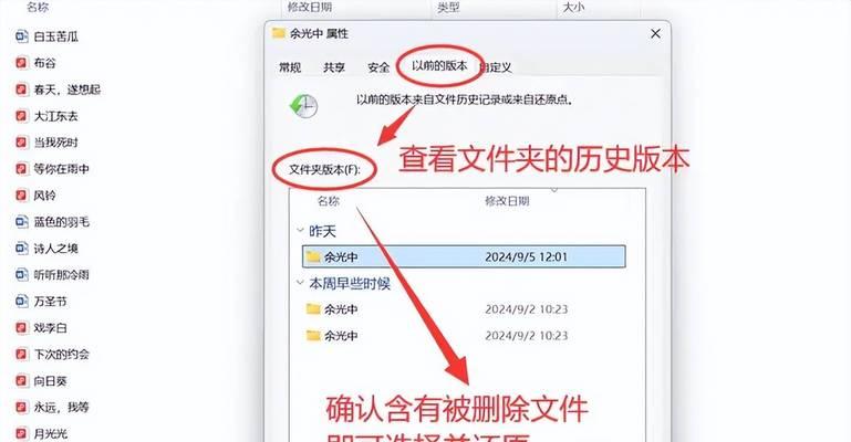 1.从回收站中恢复文件:当我们误删除一个文件时,它通常会被放入回收站中,我们可以打开回收站并找到要恢复的文件,右键单击并选择“还原”。