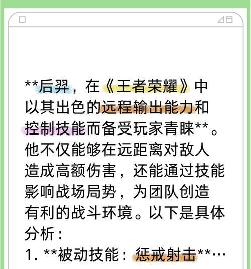 作为《王者荣耀》中备受玩家喜爱的射手英雄,后羿一直以来都是高手们必选的优秀英雄之一。但是,在实战中如何发挥出后羿的最大优势,充分利用他强大的技能和突出的远程输出能力,才能使我们的战斗获得更多胜利。本篇文章就将从后羿的技能解析开始,详细阐述后羿的操作技巧,为广大后羿爱好者提供有效的指导。