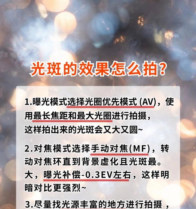 尝试不同焦距镜头:不同焦距的镜头在产生光斑效果时会有不同的表现,可以尝试使用长焦镜头或广角镜头来探索光斑效果的多样性。