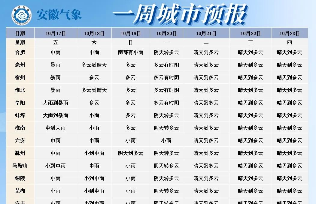 17日(周五):沿淮淮河以北阴天转多云有大雨,部分地区暴雨;江淮之间阴天有小到中雨;沿江江南多云转阴天有阵雨或雷雨。