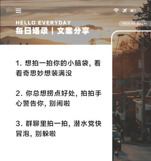 微信是现代社交中最常用的工具之一,而其中的“以拍一拍”功能可以给我们的社交带来更多的乐趣。但如何用幽默的方式来设置“以拍一拍”呢?下面将为大家分享一些技巧和方法。