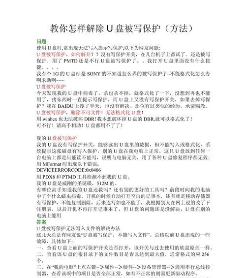 随着科技的发展,U盘已经成为了现代人生活中必不可少的存储工具,但是在使用U盘的过程中,有时候会遇到U盘被写保护的情况,导致无法正常使用。本文将详细介绍U盘解除被写保护状态的方法,希望能够帮助到遇到这种问题的朋友们。