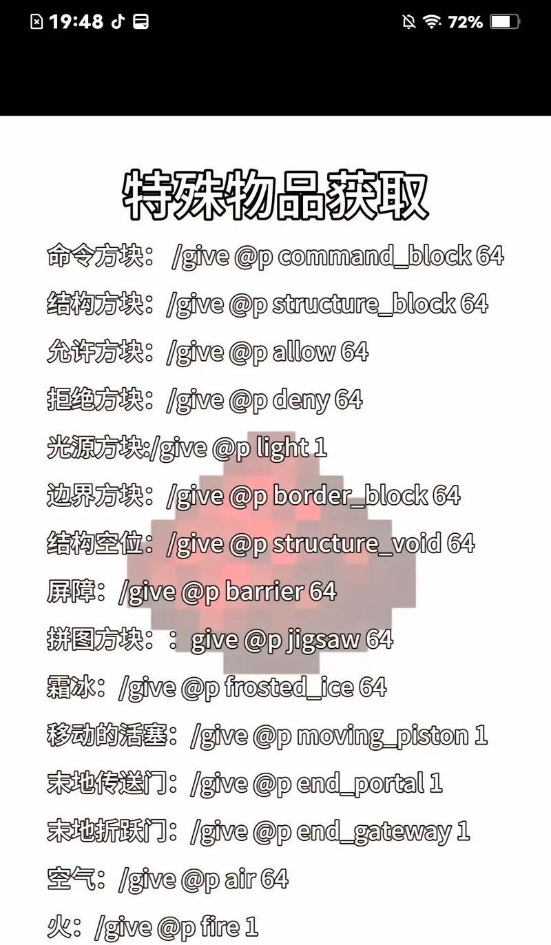 这个指令可以让你给自己或其他玩家任何物品,包括方块、工具、武器等等,使用方法简单易懂。