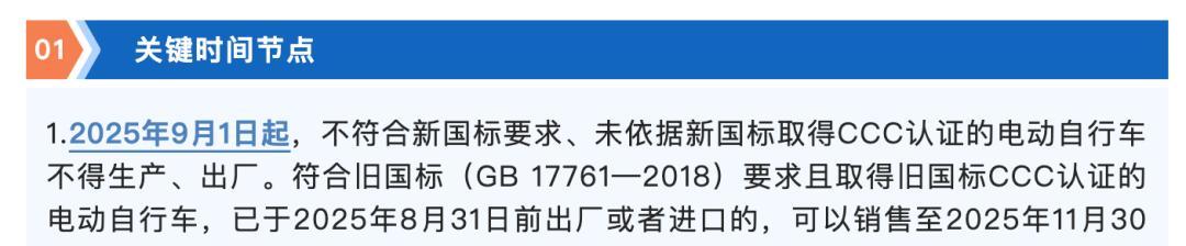 新国标自9月1日实施以来,给予旧标准车辆3个月销售过渡期,2025年11月30日后旧标车禁止销售,新生产车辆必须符合新国标要求。从12月1日起,所有销售的电动自行车必须符合新国标,旧标车无法上牌。消费者购买时需选择贴有3C认证标志、执行标准为GB17761-2024的产品,主动索要发票和合格证。