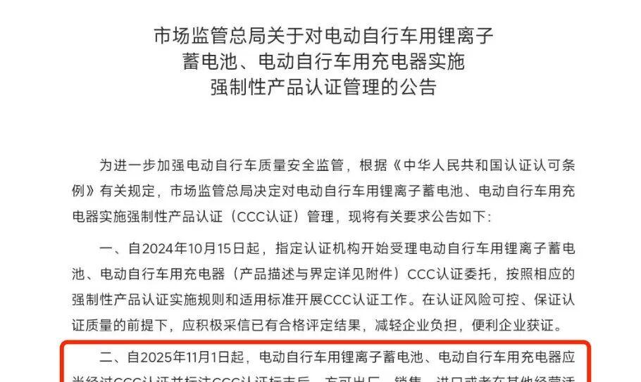 电动自行车用锂离子蓄电池安全技术规范去年4月份强制性国标获批后,市场监督总局对电动自行车用锂离子蓄电池、电动自行车用充电器实施强制性产品认证(CCC认证)管理,自2024年10月15日起受理认证委托。