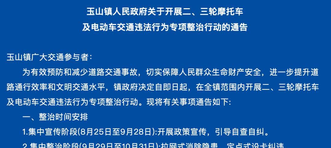 福建玉山镇发布关于开展二、三轮摩托车及电动车交通违法行为专项整治行动的通告,将专项整治行动分为四个阶段,9月份集中宣传,10月份集中整治,11月份集中查处阶段,12月开始长效管理阶段。