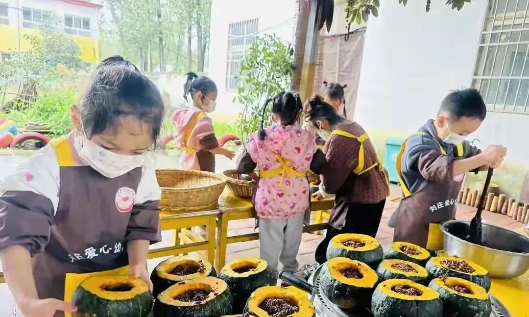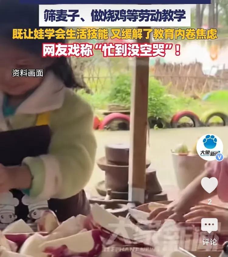 这所藏在乡村里的幼儿园,曾是只有几十个孩子的普通园所。2022年前后,有着20年幼教经验的园长陈雪艳,结合农村本土资源推出“餐饮式”教学,打破了传统幼儿园的课堂边界。如今走进园区,曾经热门的滑梯因无人问津而“失宠”,灶台边却满是系着迷你围裙的小小身影:有的踮脚够着灶台翻炒鸡块,香气飘满院落;有的蹲在地上仔细挑拣麦子里的杂质,神情专注;还有的双手反复按压面团,即便沾满面粉也笑意盈盈???。从筛麦子到烙饼,从炖菜到做烧鸡,孩子们全程参与,甚至能独立完成一整套美食制作流程。