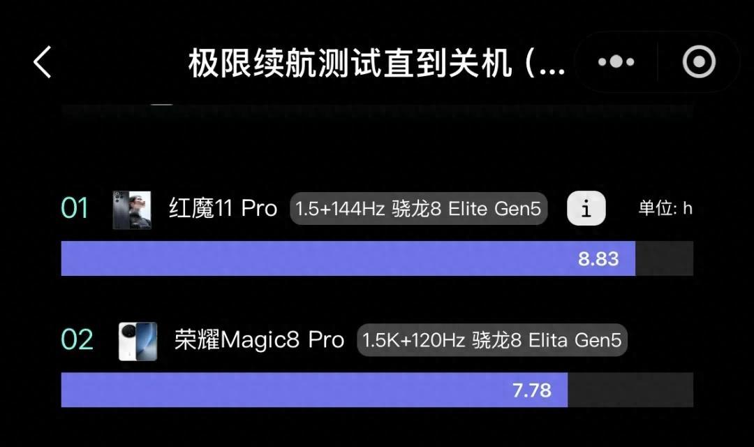 如上图所示,在涵盖5G游戏的重度负载场景测试中,红魔11 Pro的续航时间都可以达到8.83小时,位列排行榜第一,且领先幅度较大。