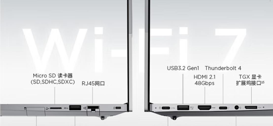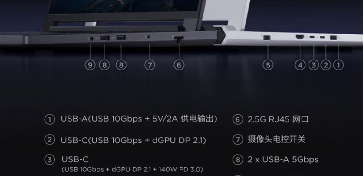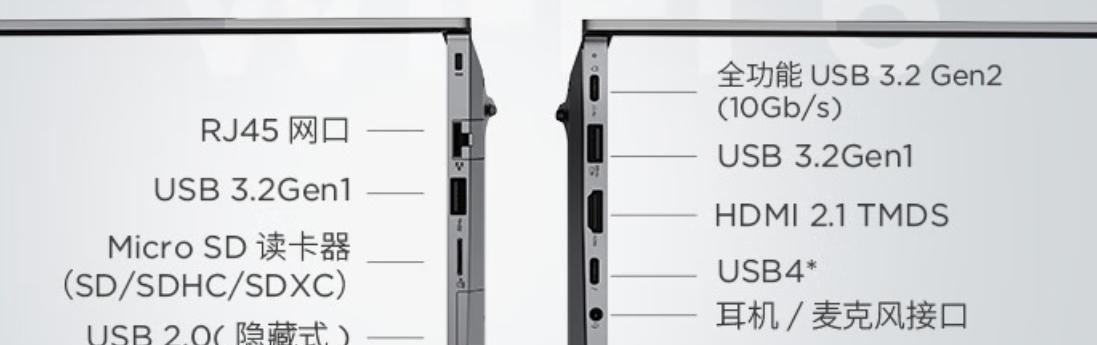 1x全功能 USB-C 3.2 Gen2(10Gb/s),1xUSB4,2xUSB 3.2Gen1,1xHDMI 2.1,1xMicro SD读卡器,1x隐藏式USB-A(USB2.0),1x耳机/麦克风接口,1xRJ5网口。
