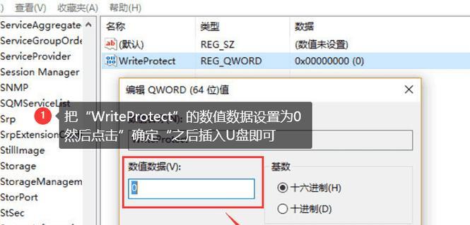 在Windows系统中,我们可以通过更改注册表中的键值来解除U盘的写保护状态。具体步骤为:打开“运行”窗口,输入“regedit”,找到“HKEY_LOCAL_MACHINE\SYSTEM\CurrentControlSet\Control\StorageDevicePolicies”路径,修改键值为0。