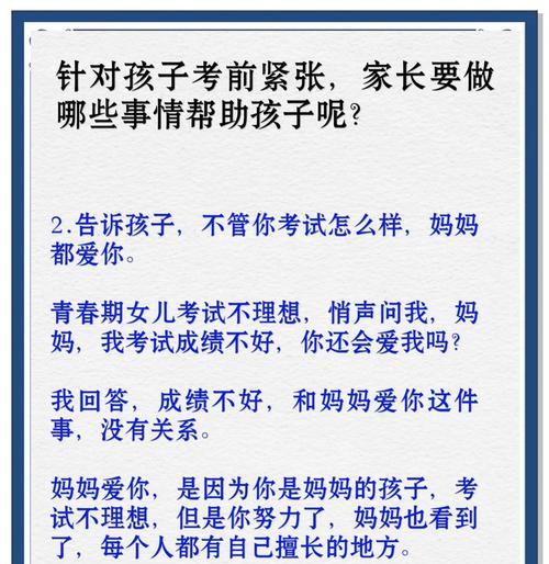 随着学校教育的深入,考试已经成为孩子们成长过程中不可避免的一部分。而孩子考试前的紧张情绪也时常困扰着家长。如何帮助孩子缓解考试前的压力,让他们轻松面对考试,成为了许多家长们关心的重要问题。