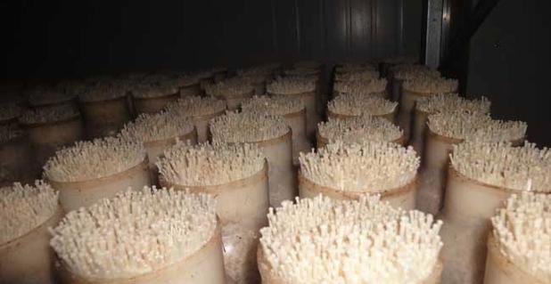 在培养过程中,我们需要将培养基转移到菌棒中,为金针菇的正式种植做准备。
