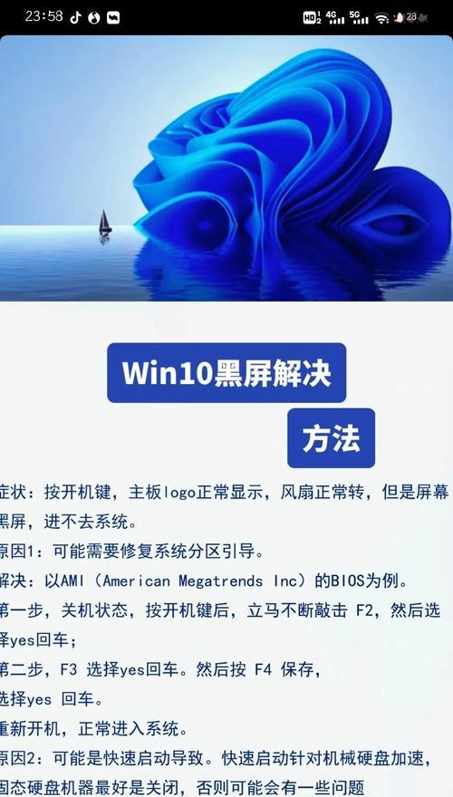 6.检查操作系统:如果操作系统出现故障,也可能会导致电脑黑屏。此时可以使用系统恢复工具或者重新安装操作系统。