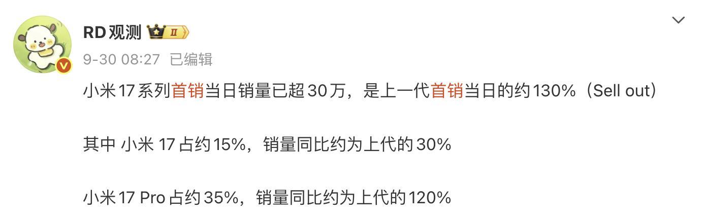 剩下的机型是小米17和小米17Pro,它们的占比分别为15%和35%,对应的单品销量为4.5万台和10.5万台。截止到10月11日,小米17系列销量已经超过120万台,如果Pro系列没有疯狂缺货的话,这个销量应该会有很大的上涨空间。